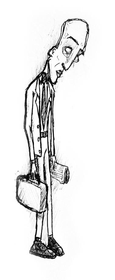To me, the guy in this doodle is down and out. Just been fired or perhaps just depressed at the state of the world he reads about in his paper. It started out as a quick scribble and evolved into this all based on the orientation of the eyes and eyebrows. The fact they're looking down dictated that the head was also facing down etc.